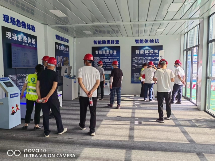 碧桂園鳳凰城三期項目由六棟高層住宅樓、配套商業(yè)及地下車庫組成,總建筑面積為 115340㎡,主體施工采用附著式全鋼爬架+新型鋁合金模板等施工工藝。該項目工序穿插作業(yè)多、群塔作業(yè)等安全管理協(xié)調(diào)難度大,項目積極采用群塔防碰撞系統(tǒng)、塔吊智能監(jiān)測系統(tǒng)、塔吊防松動預警螺母及塔吊吊鉤可視化系統(tǒng)。觀摩會現(xiàn)場中,通過智慧工地云平臺、安全管理指揮中心、VR安全教育體驗館等全面展示了項目施工現(xiàn)場智慧工地和文明施工管理現(xiàn)代化模式。
