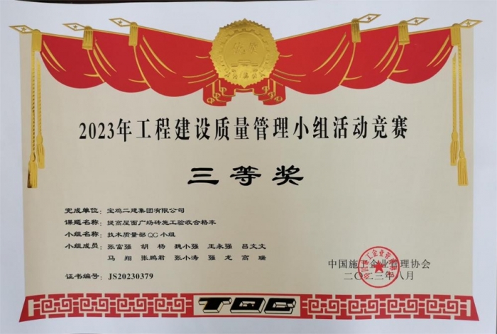 最終,碧水潤園QC小組“提高衛(wèi)生間反坎一次驗(yàn)收合格率”榮獲2023年工程建設(shè)質(zhì)量管理小組活動(dòng)競賽一等獎(jiǎng),技術(shù)質(zhì)量部QC小組“提高屋面廣場磚施工驗(yàn)收合格率”榮獲2023年工程建設(shè)質(zhì)量管理小組活動(dòng)競賽三等獎(jiǎng),明星QC小組“高層泵管清洗水處理技術(shù)創(chuàng)新”榮獲2023年工程建設(shè)質(zhì)量管理小組活動(dòng)競賽三等獎(jiǎng)。